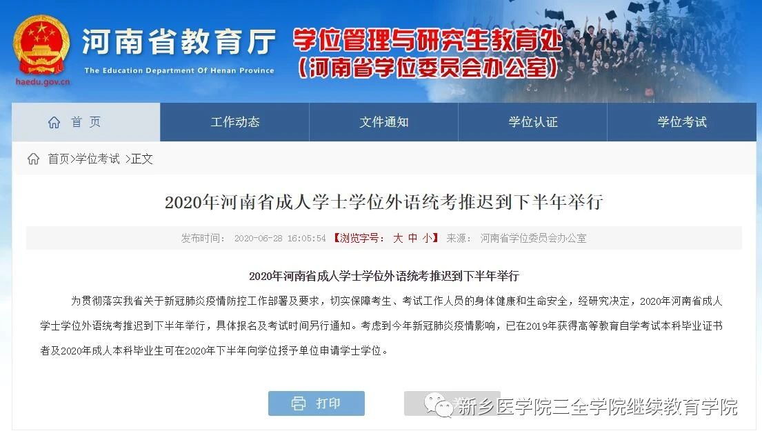接河南省学位委员会办公室通知,为贯彻落实我省关于新冠肺炎疫情防控工作部署及要求,切实保障考生、考试工作人员的身体健康和生命安全,经研究决定,2020年河南省成人学士学位外语统考推迟到下半年举行,具体报名及考试时间另行通知。