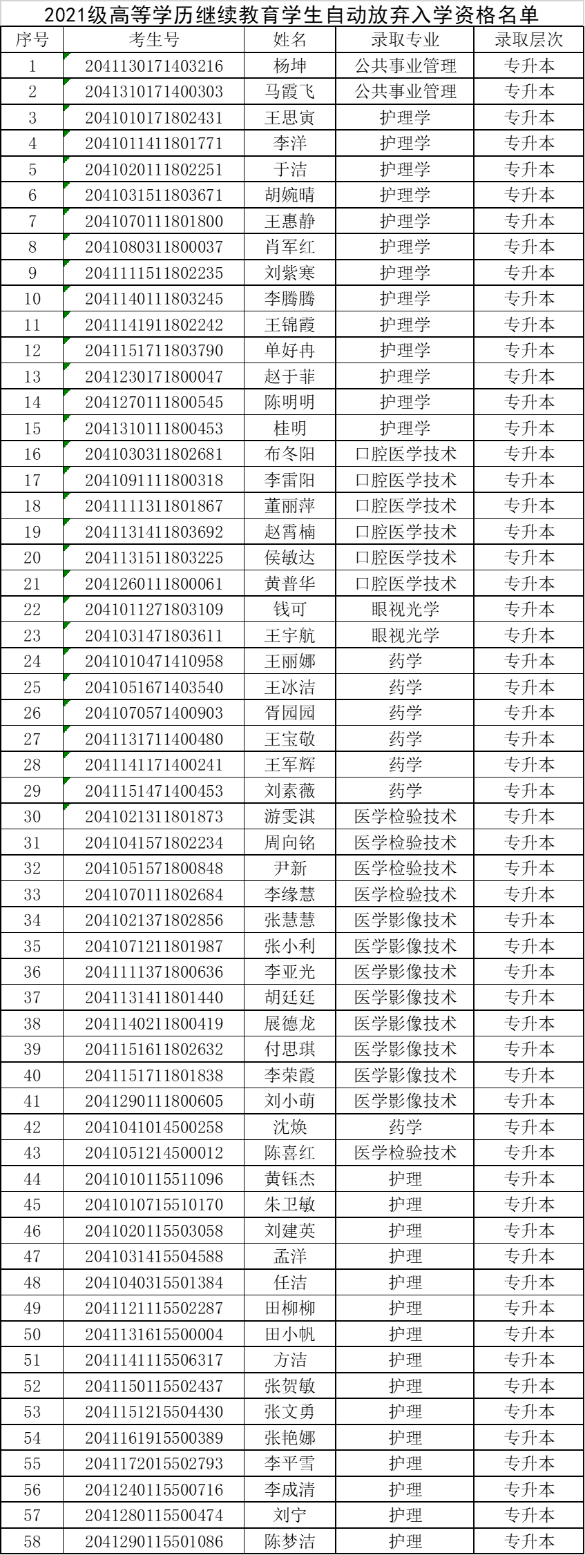 新乡医学院三全学院2020年高等学历继续教育录取新生(即2021级新生)杨坤等58名学生,未在规定时间内到校报到注册。经继续教育学院工作人员反复联系确认,有部分学生表示自动放弃入学资格、有部分学生无法取得联系或未缴纳学费报到入学。根据《普通高等学校学生管理规定》(教育部令第41号)、教育部《高等学校学生学籍学历电子注册办法》(教学〔2014〕11号)、河南省教育厅《河南省教育厅关于做好2020年普通高等学校学生工作的通知》(教学〔2020〕166号)《新乡医学院三全学院成人高等学历教育学生学籍管理规定》等文件规定,新乡医学院三全学院继续教育学院研究,决定给予杨坤等58名学生取消入学资格处理。