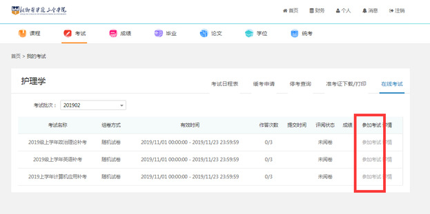 4、点击参加考试开始考试(非有效时间内无法点击) 五、注意事项 1、每门课程考试时间为180分钟; 2、每门课程三次考试机会,取最高分为本次考试成绩; 3、考试完成后自动评分,每门课程满分100分,60分及格。 4、考试期间,请同学们保障网络和电脑状况良好,如有问题,请及时联系我们。 5、联系电话:0373-7376918 |