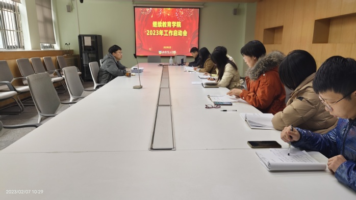 为扎实推进新学期各项工作正常有序进行,2月7日上午,继续教育学院在第四会议室召开工作启动会,安排部署2023年继续教育各项工作,强调本年度重点工作。继续教育学院全体工作人员参加会议,会议由学院院长陈扬主持。 会上,全体人员结合自身工作岗位职责及《继续教育学院2023年工作计划》,围绕23年常规工作与亮点创新工作进行了工作汇报,全面梳理工作成效、深刻剖析工作方法,进一步明确了工作思路。 陈扬分析了23年工作面临的形势及既定目标任务,指明了新学年学院发展的思路、重点任务和举措,同时要求部门全体人员要收心凝神,到岗到位拧紧发条,真抓实干起好步;要常抓学历继续教育,大抓非学历教育,突出重点打好底;要转变作风、改进方法,狠抓作风开好局;要紧盯目标、拉高标杆,全力推进各项工作提速提质提效,确保高质量完成全年目标任务。 脚踏实地启新程,全面梳理再出发。2023年继续教育学院将立足新发展阶段,以高等学历继续教育网络课程建设和实现招生录取、教务教学、质量监控、学籍管理、毕业论文、证书发放、收费等环节数字化为两翼,实现数字化转型发展;以“教学中心建设 、教学质量监控、招生”为引擎,加强教育教学内涵质量建设;以非学历教育发展为重点,补充职业认定工种,开发、引入、承办各类培训班,打造非学历教育“金名片”,扩大社会服务面。