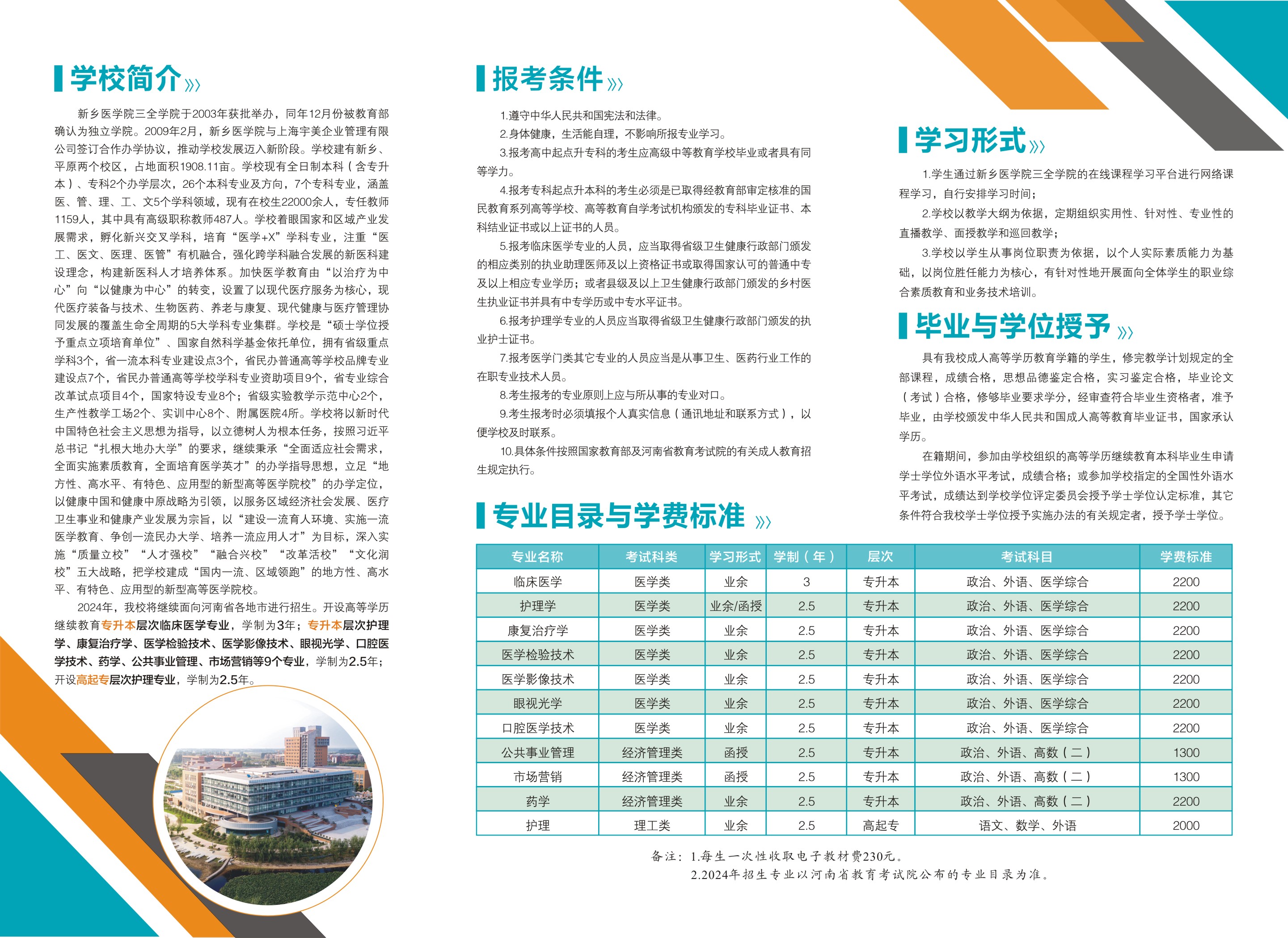 一、学校简介 新乡医学院三全学院于2003年获批举办,同年12月份被教育部确认为独立学院。2009年2月,新乡医学院与上海宇美企业管理有限公司签订合作办学协议,推动学校发展迈入新阶段。学校建有新乡、平原两个校区,占地面积1908.11亩。学校现有全日制本科(含专升本)、专科2个办学层次,26个本科专业及方向,7个专科专业,涵盖医、管、理、工、文5个学科领域,现有在校生22000余人,专任教师1159人,其中具有高级职称教师487人。学校着眼国家和区域产业发展需求,孵化新兴交叉学科,培育“医学+X”学科专业,注重“医工、医文、医理、医管”有机融合,强化跨学科融合发展的新医科建设理念,构建新医科人才培养体系。加快医学教育由“以治疗为中心”向“以健康为中心”的转变,设置了以现代医疗服务为核心,现代医疗装备与技术、生物医药、养老与康复、现代健康与医疗管理协同发展的覆盖生命全周期的5大学科专业集群。学校是“硕士学位授予重点立项培育单位”、国家自然科学基金依托单位,拥有省级重点学科3个,省一流本科专业建设点3个,省民办普通高等学校品牌专业建设点7个,省民办普通高等学校学科专业资助项目9个,省专业综合改革试点项目4个,国家特设专业8个;省级实验教学示范中心2个,生产性教学工场2个、实训中心8个、附属医院4所。学校将以新时代中国特色社会主义思想为指导,以立德树人为根本任务,按照习近平总书记“扎根大地办大学”的要求,继续秉承“全面适应社会需求,全面实施素质教育,全面培育医学英才”的办学指导思想,立足“地方性、高水平、有特色、应用型的新型高等医学院校”的办学定位,以健康中国和健康中原战略为引领,以服务区域经济社会发展、医疗卫生事业和健康产业发展为宗旨,以“建设一流育人环境、实施一流医学教育、争创一流民办大学、培养一流应用人才”为目标,深入实施“质量立校”“人才强校”“融合兴校”“改革活校”“文化润校”五大战略,把学校建成“国内一流、区域领跑”的地方性、高水平、有特色、应用型的新型高等医学院校。 2024年,我校将继续面向河南省各地市进行招生。开设高等学历继续教育专升本层次临床医学专业,学制为3年;专升本层次护理学、康复治疗学、医学检验技术、医学影像技术、眼视光学、口腔医学技术、药学、公共事业管理、市场营销等9个专业,学制为2.5年;开设高起专层次护理专业,学制为2.5年。 二、报考条件 1.遵守中华人民共和国宪法和法律。 2.身体健康,生活能自理,不影响所报专业学习。 3.报考高中起点升专科的考生应高级中等教育学校毕业或者具有同等学力。 4.报考专科起点升本科的考生必须是已取得经教育部审定核准的国民教育系列高等学校、高等教育自学考试机构颁发的专科毕业证书、本科结业证书或以上证书的人员。 5.报考临床医学专业的人员,应当取得省级卫生健康行政部门颁发的相应类别的执业助理医师及以上资格证书或取得国家认可的普通中专及以上相应专业学历;或者县级及以上卫生健康行政部门颁发的乡村医生执业证书并具有中专学历或中专水平证书。 6.报考护理学专业的人员应当取得省级卫生健康行政部门颁发的执业护士证书。 7.报考医学门类其它专业的人员应当是从事卫生、医药行业工作的在职专业技术人员。 8.考生报考的专业原则上应与所从事的专业对口。 9.考生报考时必须填报个人真实信息(通讯地址和联系方式),以便学校及时联系。 10.具体条件按照国家教育部及河南省教育考试院的有关成人教育招生规定执行。 三、报考流程 1.网上报名:考生请于9月初(以河南省教育考试院公布的时间为准)访问河南省教育考试院网站(http://www.haeea.cn),登录“河南省成人高校招生考生服务平台”,了解成人高校招生政策和规定,查询学校招生有关情况,阅读并签订《河南省2024年成人高校招生考生承诺书》。考生需选择信息审核确认点,并按照系统提示要求,准确填写本人基本信息,选择报考层次、学校、科类、专业等信息(仅可填报一所学校的一个专业,所有考生的志愿一经确定,不得更改)。 备注:报考学生需谨记报名账号及密码。 2.网上审核:完成基本信息填报后,关注河南省教育考试院微信公众号,按照系统提示上传本人近期免冠照、身份证、毕业证和证书等相关证明材料原件图片信息。考生完成报名信息在线采集,等待辖区招生考试机构报名信息审核确认。 备注:考生报名信息网上审核通过后一律不得更改。审核结果通过河南省教育考试院微信公众号、手机短信等方式推送给考生。考生需及时登录“河南省成人高校招生考生服务平台”查询审核结果。 3.网上缴费:已“审核通过”的考生即可网上缴费、完成报名手续。 备注:“审核不通过”的考生,不具备报考资格。逾期未缴费的考生报名资格无效,不能参加考试。考生报名资格审核通过,完成缴费后不再退费。 3.打印准考证:考生可于考前一周内访问登录“河南省成人高校招生考试服务平台”,自行打印准考证。 4.考试科目:统考科目按教育部《全国各类成人高等学校招生复习考试大纲》(2020年版)命题。所有统考科目每科试题满分均为150分。高起专的统考科目每门考试时间为120分钟,专升本的统考科目每门考试时间为150分钟。。 5.参加成人高考考试:考试时