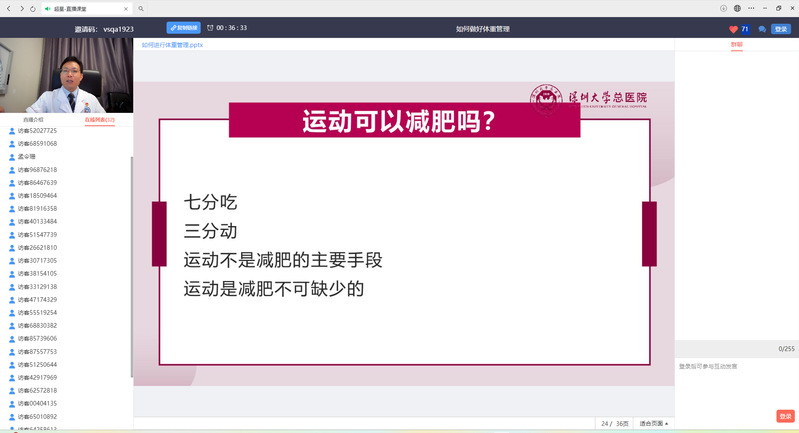 7月8日至10日,由继续教育学院举办的第五期“医教协同”云讲坛开讲。本期讲座聚焦了当下人们普遍关注的健康话题,包括“假如情绪会说话”、“糖尿病患者的饮食照护”、“血常规检验及案例分享”以及“如何做好体重管理”等,吸引了我校高等学历继续教育学生和众多医疗工作者的积极参与。 明阿欢老师在“假如情绪会说话”的讲座中,指出情绪并非无形的存在,而是我们内心的“声音”,学会倾听和理解这些“声音”,对于保持良好的心理状态至关重要。王静教授以“糖尿病患者的饮食照护”为题,详细介绍了各类食物的升糖指数以及适宜的摄入量,为糖尿病患者带来了实用的饮食指南。贺志安教授结合丰富的临床经验,对血常规检验的各项指标进行了详细解读,并分享了多个典型案例。最后,“如何做好体重管理”成为了讲座的压轴主题。深圳大学总医院蔡飞跃主任从认知、饮食、运动等三个方面阐述了体重管理的要点。蔡主任为观众提供了个性化的体重管理建议,鼓励大家树立正确的健康观念,积极采取行动,实现健康体重。 此次直播讲座内容详实、实用性强,为观众带来了丰富的健康知识盛宴。在互动环节中,观众们积极提问,专家们耐心解答,形成了良好的交流氛围。通过4场讲座,观众们不仅获得了宝贵的健康知识,也提升了自身的医学专业素养和技能水平。 据悉,自2020年以来,我校“医教协同”云讲坛已连续举办5年,培训达12000人次,2023年获新乡市终身学习品牌项目称号。该项目以医学培训为核心、素质与能力提升为重点,旨在提升医疗人才培养质量、满足人民群众健康需求。未来,我们将共享更多的优质教育资源,服务更广泛的学习对象,提供优质的终身学习服务,打造终身教育特色品牌,不断提升继续教育服务经济社会发展的能力和水平,为构建“人人皆学、处处能学、时时可学”的学习型社会贡献力量。