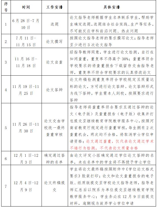 三、论文格式要求 1.毕业论文的格式及要求见附件2; 2.学位论文的格式及要求见附件3; 四、特别提醒 1.论文通过查重,仅代表论文通过学术不端行为检测,不代表论文质量合格,因此申请学士学位的学生,其论文通过查重也不代表一定能够获得学位。 2.按照教育部文件要求,所有授予学士学位的论文须上传至国家本科毕业论文抽检信息平台,接受审查。抽检不合格者将被通报,并撤销已经授予的学位。拟申请学士学位的毕业生须严格按照要求,认真、慎重对待学位论文工作,积极主动联系论文指导教师,尊重指导教师意见,自觉自主开展论文撰写、修改和完善工作,确保论文质量。论文在后续的审查如果出现不合格等问题的,将进行责任倒查。 如有疑问,请在工作日9:00-12:00、14:00-17:00咨询,联系电话:0373-7376918 未尽事宜,参照河南省学位办及学校有关文件执行。 备注:授予学士学位条件 1.在规定的修业年限内修完教学计划规定的全部课程,累计学分达到人才培养方案规定要求;思想品德鉴定合格,所有课程考核成绩合格,平均成绩达到65分(含)以上,学位课程平均成绩达到70分(含)以上; 2.高等学历继续教育本科毕业生毕业论文答辩成绩或毕业考试成绩合格,经审核准予毕业; 3.参加由学校组织的高等学历继续教育本科毕业生学士学位外语水平考试,成绩合格;或参加学校指定的全国性外语水平考试,成绩达到学校学位评定委员会授予学士学位认定标准; 4.符合以上要求的准予授予学士学位。因其它原因,经校学位评定委员会审议未通过者,不授予学士学位。
